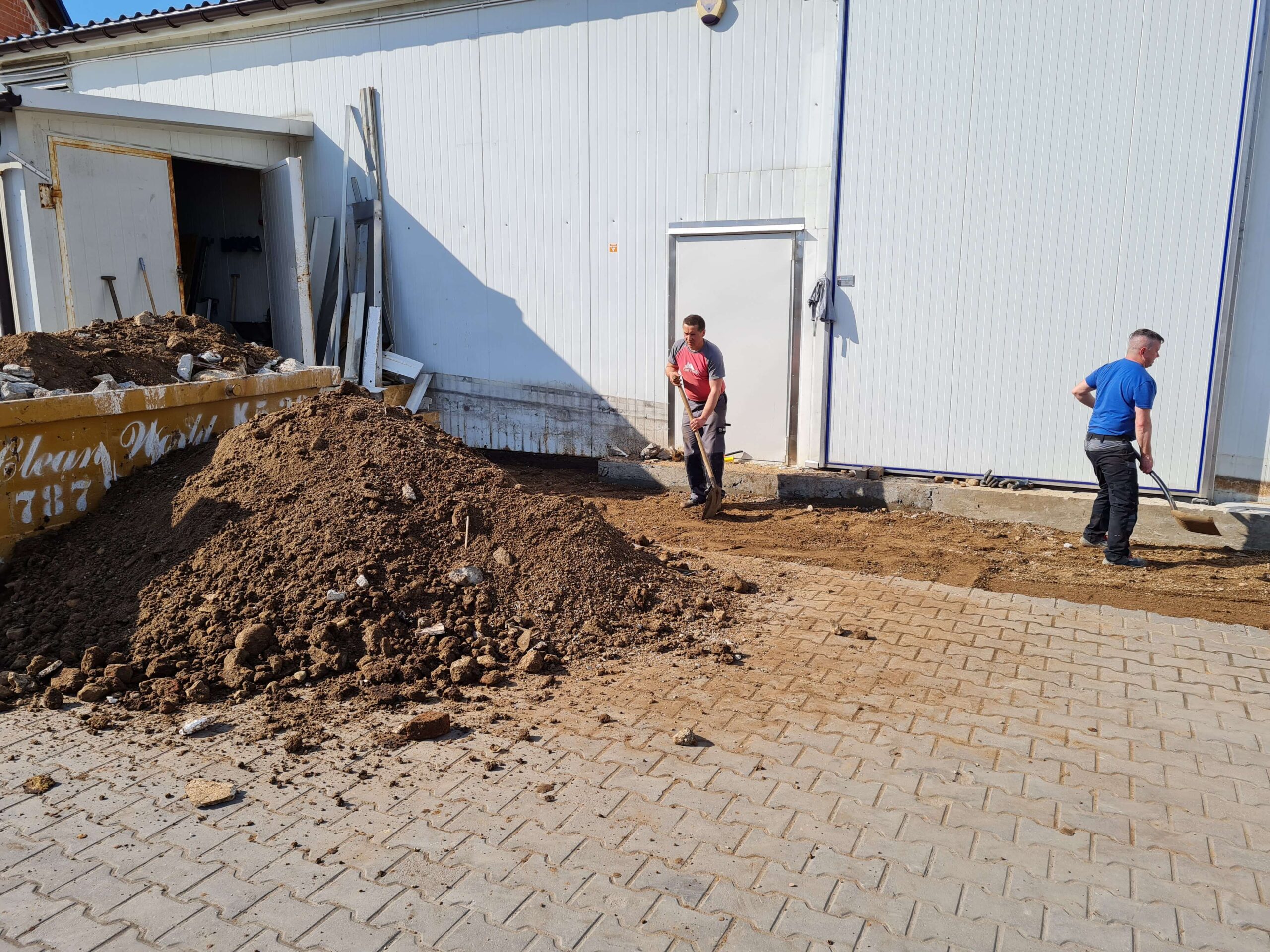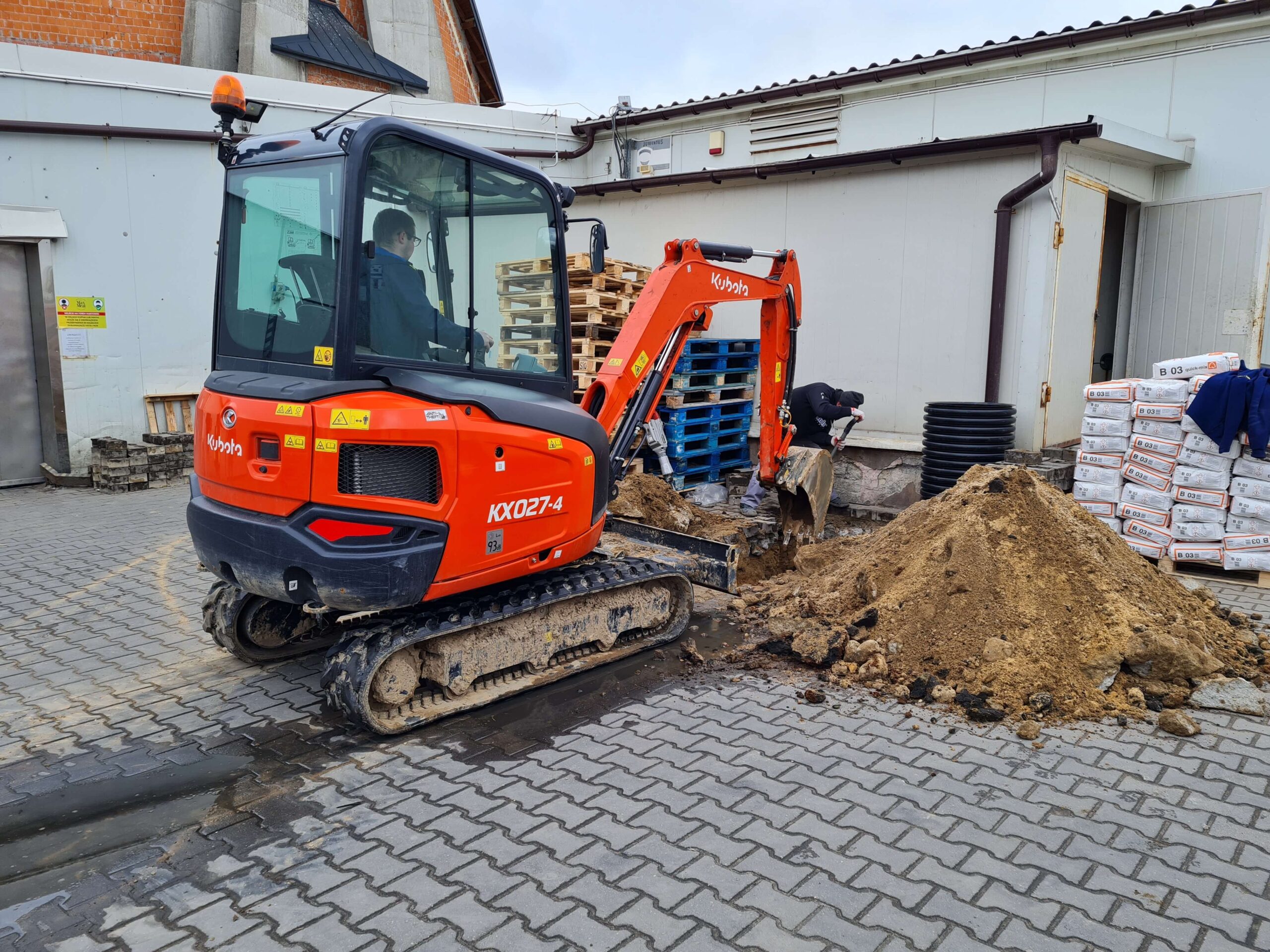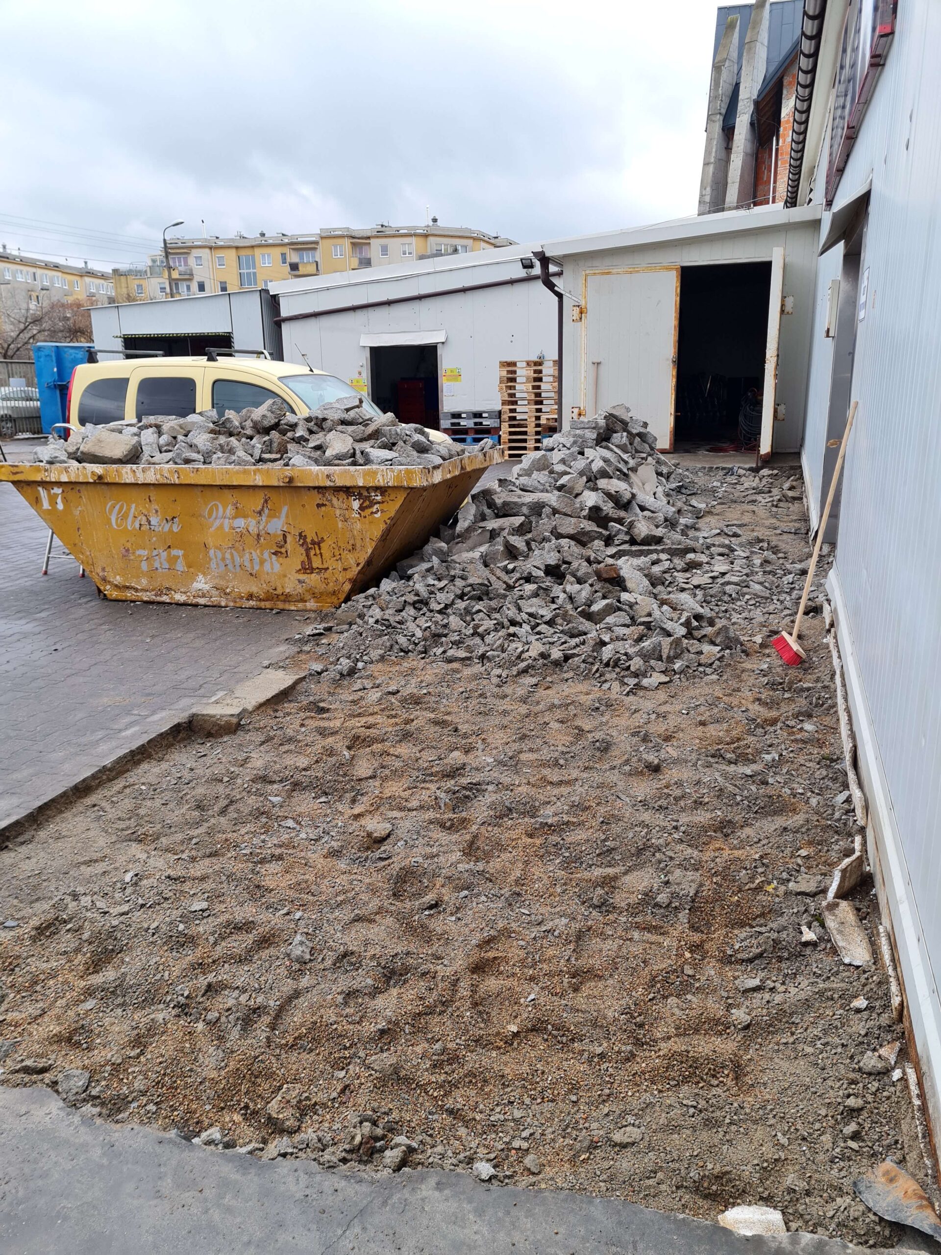prace zewnętrzne: wyburzenie starego podjazdu, wyrównanie terenu, wykonanie nowej kostki brukowej,